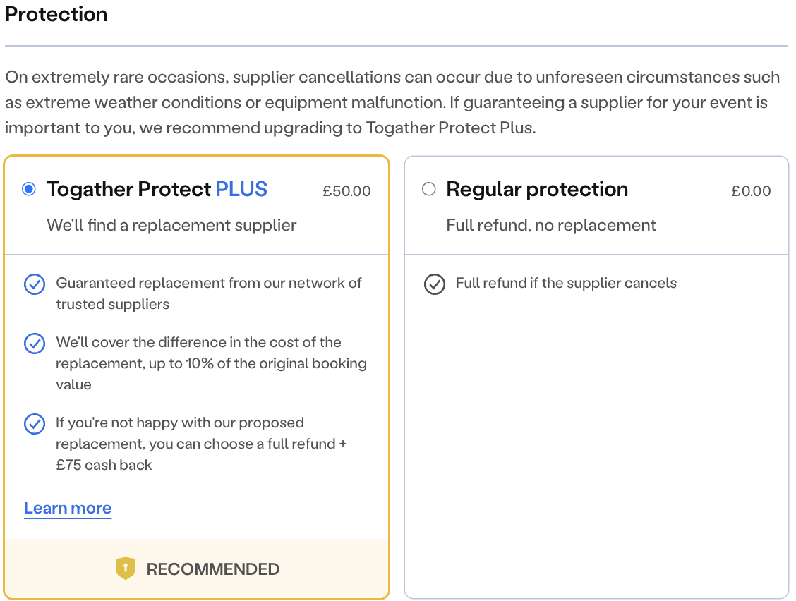 Every booking automatically includes secure payment protection and a full refund if a supplier cancels- just without the priority support or guaranteed replacement included in Protect Plus.