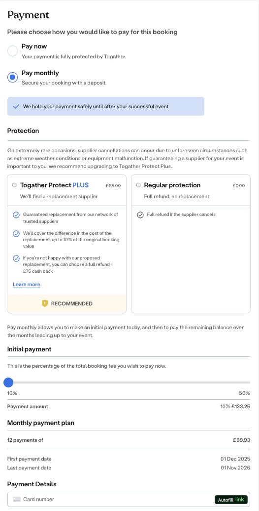 If your event is more than two months away, you can split the cost into simple, interest-free monthly payments.