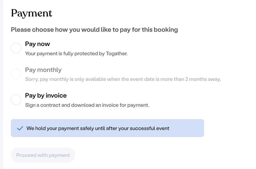 When you click “Book now” on a quote, you’ll see all the payment options available for your event.